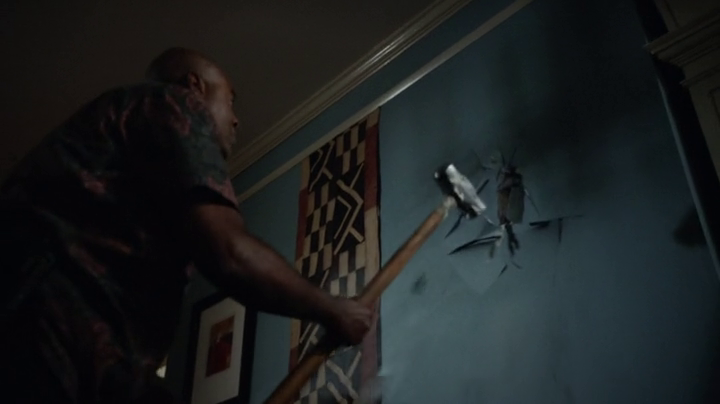 For example, at the beginning of the show, Holm manipulates the automated controls of the home network in the house where Wells is babysitting, causing the temperature to drop. When the baby upstairs starts crying, she leaves her cell phone and goes upstairs where everything is OK. When she returns, the phone isn't where she left it, but it is in a darkened room upstairs next to the baby's room. Somehow Holm managed to get it and sneak it up there without her seeing him.