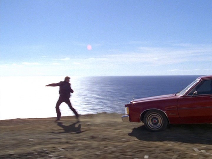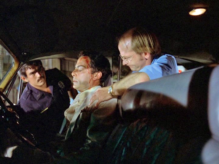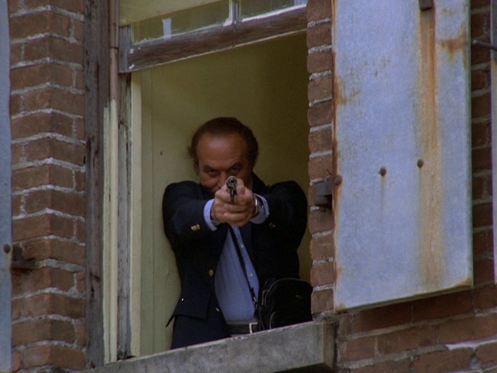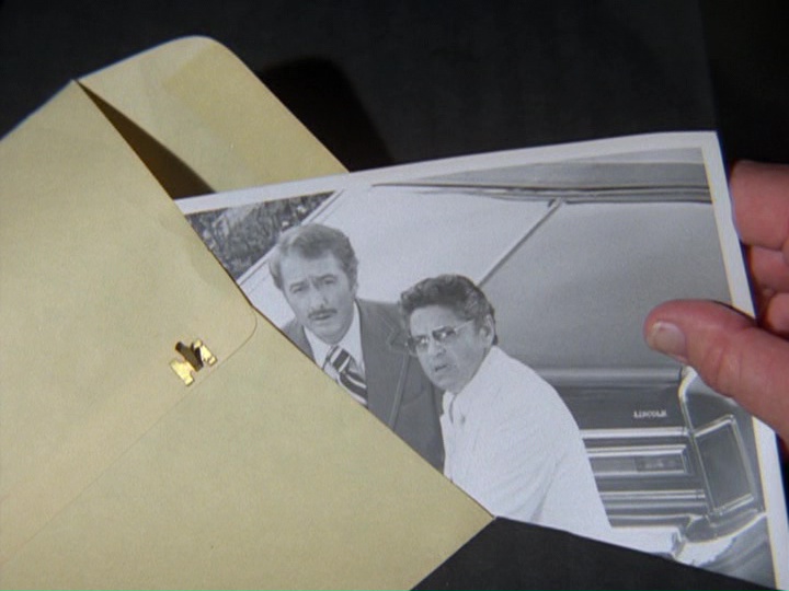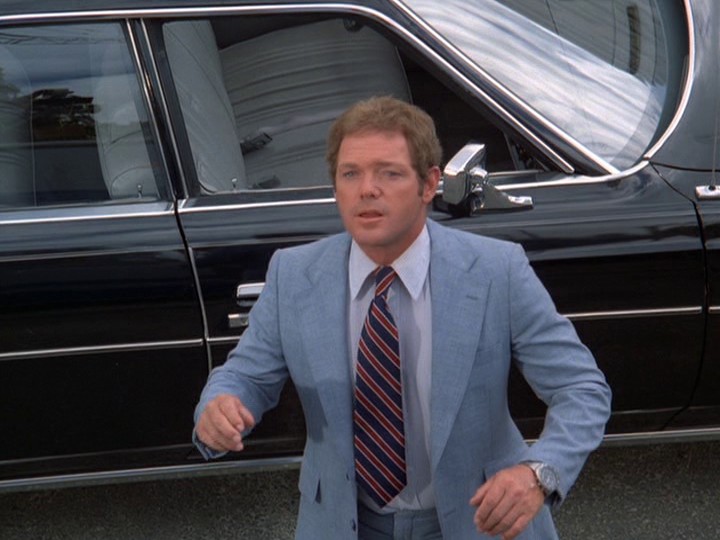 Conrad is later crushed by a car driven by Hansen, and the crime lab determines that the killer car has "paint of German manufacture" (she was driving a Mercedes). I don't understand why Conrad can't flee off to the side of the parking garage when being pursued by the car ... instead, he runs up against the garage wall and the car slams into him despite him having to step over a curb. When he is killed, the soundtrack goes dead and the pre-commercial "wave" following is totally silent, I think the only time this happens in the entire series.