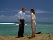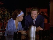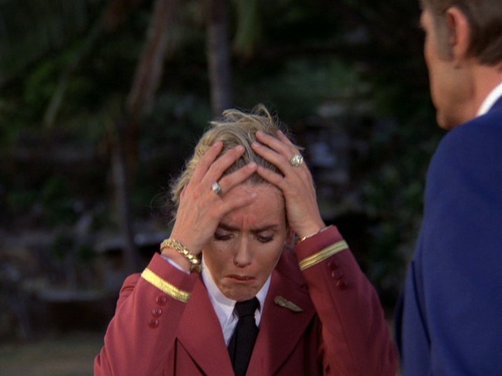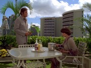 Over a drink (just her, not McGarrett — again!), she tells him, "I'm still married to Luke. You can't kill what I feel here," adding, "I've had other men. I'm not pristine." McGarrett tells her, "I must warn you that if your husband is alive, he may be engaged in some very serious and ugly criminal operation. And if I find him, he may spend the rest of his life in Leavenworth Prison." McGarrett gets a call from one of her husband's stooges, wanting to arrange payment for the ring.