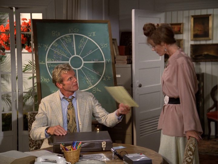 As McGarrett, Duke and Danno are discussing this recent outbreak of killing in the Five-O office, Agnes du Bois (Samantha Eggar) shows up. Announcing that she is "considered to be among the top in my profession," which is astrology, she tells them she has been "doing some research for a new book, Astrology And The Criminal Mind, including research on the recent stabbings. All four victims had "Mars square Uranus" in their astrological charts, which were based on their "natal horoscopes."