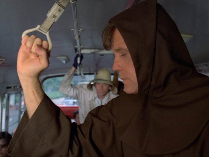 A police dragnet is mounted to locate Sandover, who dresses like a local worker and manages to escape on a bus. McGarrett, on the other hand, seeing a band of monks, manages to get one of them to part with his robe (no idea if the guy is now running around with no clothes!) and follows Sandover on the same bus, coming within inches of the guy at one point.