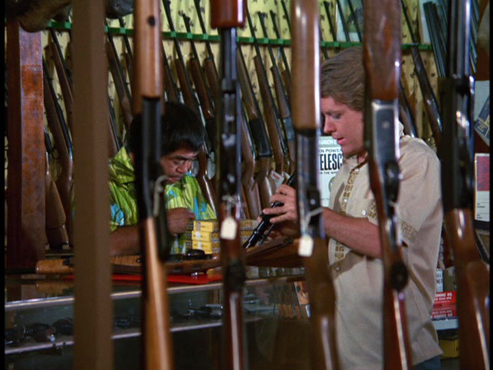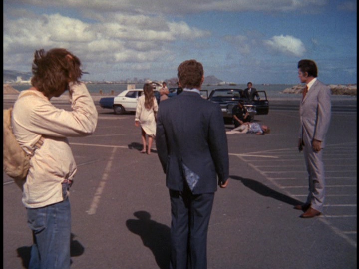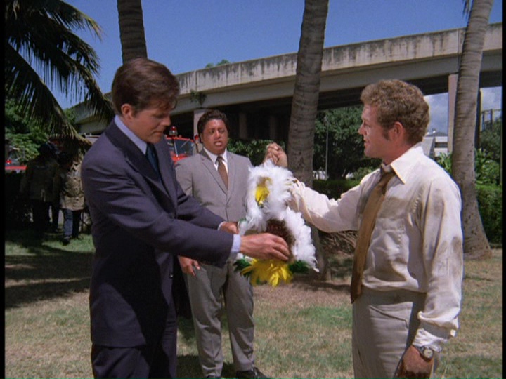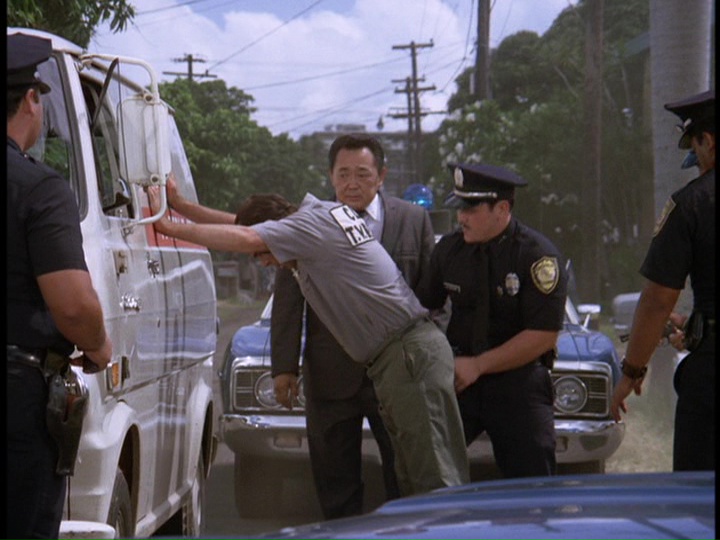 - In the opening teaser for the episode, a sailor is shown going to make a heroin drop-off at the White Horse Tattoo Parlor. He arrives at the tattoo parlor to make his delivery in a Bernie's Cab, license number 8C-6310. This cab and scene are the same as when David Birney, pursued by McGarrett and Danno in a white Mustang, makes his heroin delivery at the same location at the close of the show, but shot from a different angle. You can see the white Mustang, with McGarrett in the passenger seat, make the hard left turn in the teaser. The person in the cab in the teaser is intentionally hard to see. You even have the same vehicles behind the Mustang in the teaser as in the closing scene: a beat-up brown pickup truck and a green car off to the pickup's right. As well, on the street corner you can see a guy in a blue shirt and a man with a little kid. Thanks to Mark Lewonczyk for pointing this out.