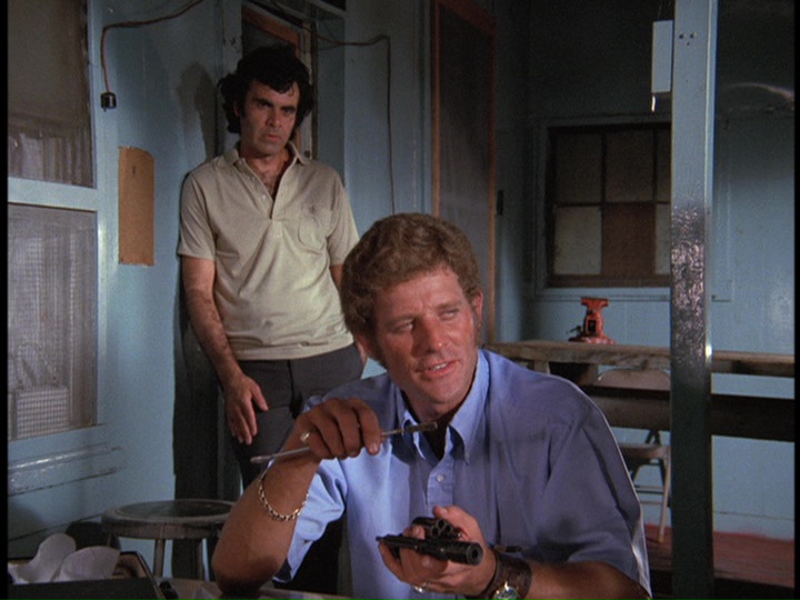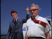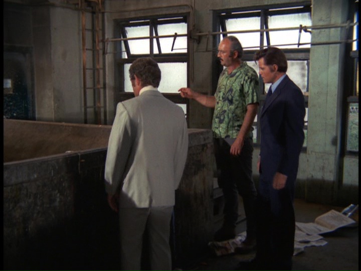 The captain of the Haskell has the crew "run a test exercise" involving a man overboard (actually a dummy) to keep them distracted while Danno and others check out all the fire extinguishers on the ship to find where the heroin is hidden. Danno eventually locates it, but puts it back, and after the ship returns to port, a closed-circuit TV camera is quickly set up to monitor the particular extinguisher which contained the heroin. A workman identified in the credits only as "Hard Hat" (David Doyle, of Charlie's Angels fame) comes on board to retrieve the dope, but he is nabbed by McGarrett and the others, and forced to continue with the "drop," which is further surveilled.
