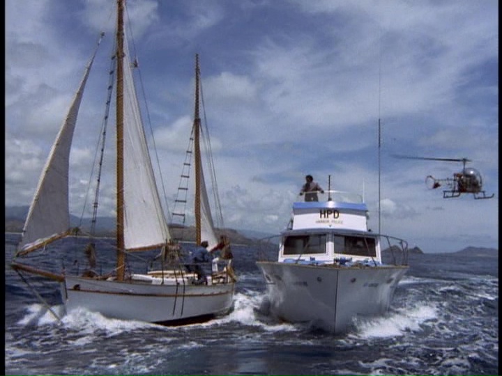 Soon after this, seemingly not willing to let Danno deal with things on the Haskell by himself, McGarrett shows up on a tug (a real tug, USS Wahpeton (YTM-757)) and transfers to the Haskell, even though the Haskell is still two days away from Oahu. This does not make any sense — surely he would have arrived on a ship larger than this. The sequence where he transfers from the tug to the Haskell goes on for almost 3 and a half minutes, obviously taking advantage of the "co-operation" of the Navy.