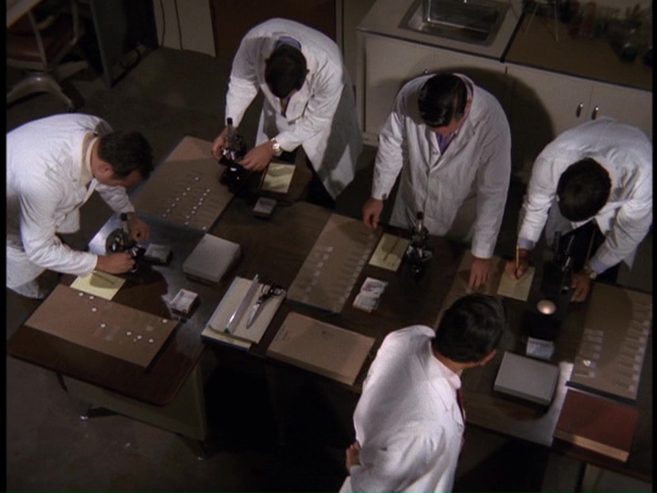 Back in Hawaii, Che Fong is feeling the pressure to come up with answers based on "scrapings off Woodley's shoes, pocket lint, hair, clothing, hat," anything. He finds a "granular chemical compound" under the fingernails of Woodley's right hand which he determines, with the help of four lab assistants, to be "potassium chlorinate," a non-existent chemical compound, later modified to "potassium bicarbonate," really used as a suppression agent in dry chemical fire extinguishers. Of course, McGarrett knows exactly what this is, what they "used to call Purple-K in the Navy."