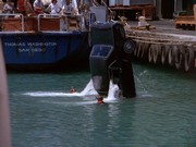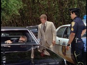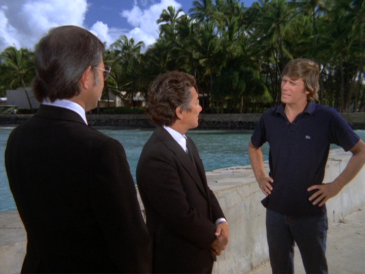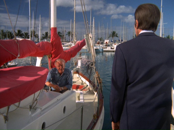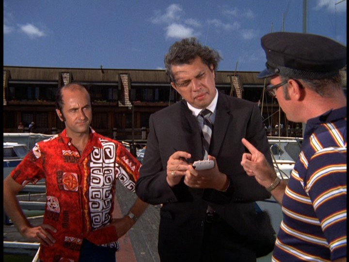 The driver of the robbery car and his large attaché-like case containing the proceeds from the banks vanish onto the ship. McGarrett and Danno arrive, and soon after this, the cops bring Gordon to the docks, saying "We found him near the golf course on Ala Wai [spelled Alauai in the subtitles] Boulevard." IDd as "a hostage in the bank shooting," Gordon tells McGarrett that the "crazy gunman who drove the getaway car" tried to kill him by shooting at him three times before Gordon "jumped out of the car." Gordon says, "I guess he would have kept shooting except the police were on his tail." If this was the case, it seems odd that the police didn't see this happening at the time.