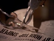 Soon after this, Smith sends another special delivery letter to McGarrett which Chin delivers. McGarrett is very careful to handle it with tweezers and avoid touching it by holding it in its plastic evidence bag. (The tweezers seemingly appear out of nowhere; McGarrett is like Houdini. He uses the tweezers to open the envelope by ripping the flap.) But McGarrett touches the enclosed newspaper article with his hand (you can see his thumb in the picture) and gives this article to Danno who handles it without any precautions at all! This article is written by Nacy Courey and spells Lihau's name "Lahoud." The article contains the usual bogus newspaper text, some sections of which are repeated. Danno describes Lihau as "a real piece of dirt."