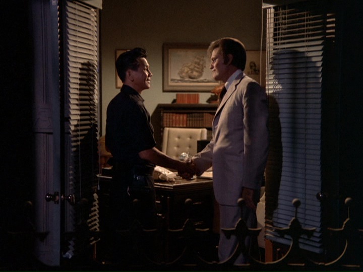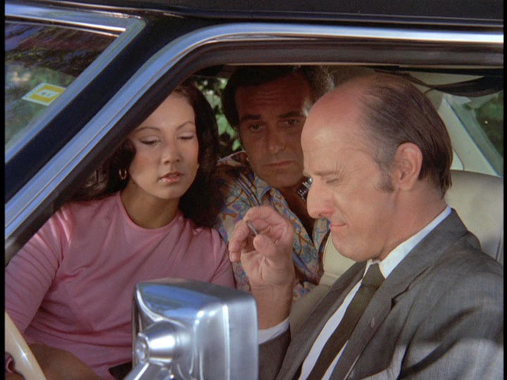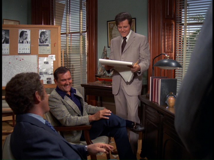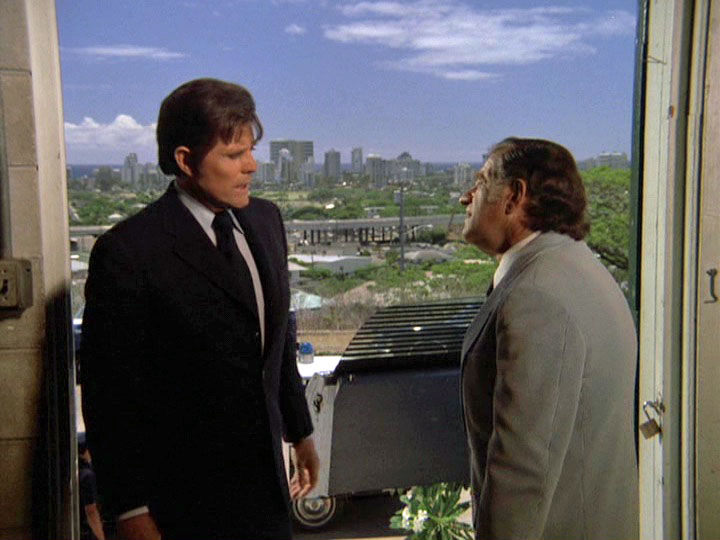 Zerbe's nervous, gum-chewing portrayal of Smith is very edgy, though the way Smith's letters are written tries a little too hard to make him look stupid. He seems pretty articulate when he is issuing instructions to McGarrett during the wild goose chase around town. The way Five-O unsuccessfully tries to make a connection to a suspect named Wheeler which does not pan out because the guy was in the hospital when Furika was being gunned down is an interesting detail. The music by Ray contains the usual stock tracks like the trombone interval theme and also some ominous bass passages.