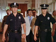 Later, as Chin and Ben watch the monitors, Bordeaux, dressed in a security guard outfit, enters the Scherzingers' room with his master key and finds their valuables, which are in a locked box hidden under the liner of a steamer trunk (such an obscure location — would the guests really have told the manager this?)