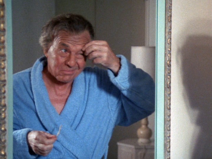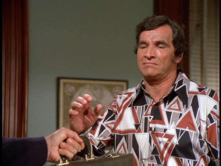 David Wayne plays an elderly (these days "middle-aged") crook named Bordeaux, a.k.a. S.R. Horus, who is a master of disguise, similar to Lewis Avery Filer in S03E11, "Over Fifty? Steal!" and that show's mediocre sequel, S04E14, "Odd Man In." There are numerous parallels to the Filer episodes, especially the music, some of which is reused from the earlier shows along with excerpts from Bruce Broughton's score to S06E11, "The Finishing Touch."