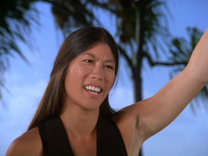 Gail Strickland is Elena Lewis, a feature writer for Transpacific Wire Services. Over the ship-to-shore radio, Chin cautions McGarrett that she is licensed to carry a gun. In the ship's dining room, Lewis sends over a bottle of champagne to McGarrett, telling him, "I like to meet attractive men, and I'm not very good at shuffleboard." He describes this gesture as "a friendly ice-breaker at $14 a throw." When he asks her why she did this, she replies, "We're supposed to be the liberated sex." He says, "No, no, honey, I don't buy it ... with your looks, you don't have to give away bubbly." Yawn! Strickland has a somewhat more substantial part in next season's "How To Steal A Masterpiece."