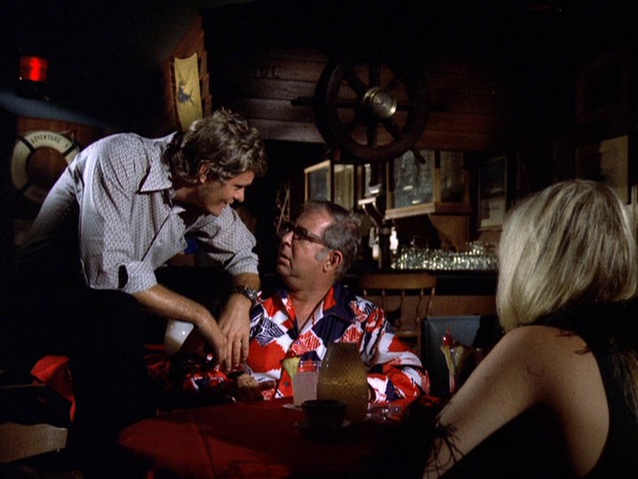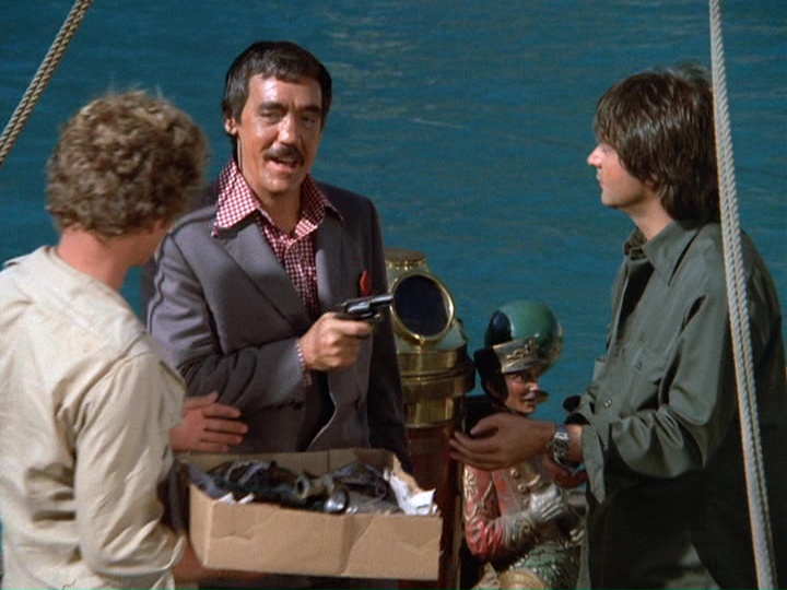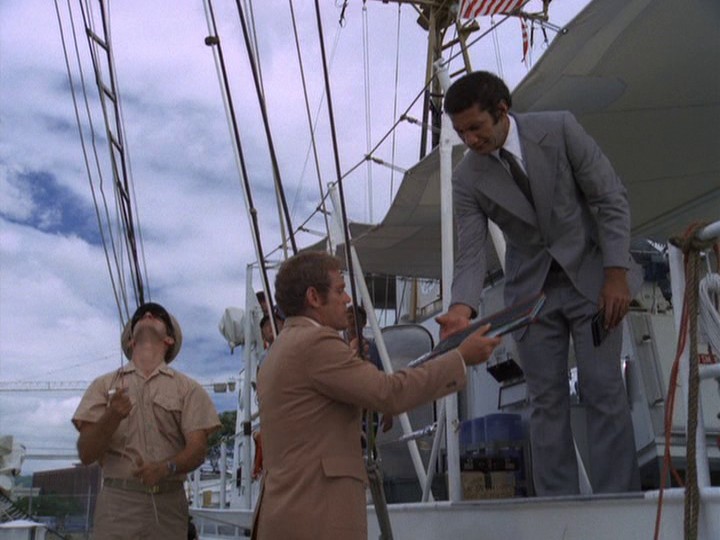 I don't know whether most of the filming during this show was done on the ship while it was between Honolulu and San Francisco (a voyage of five days); I kind of doubt this. There are some shots of the ship taken from above, probably stock shots. Considering the show is only about 50 minutes long, there is no opportunity to have a "floating Grand Hotel" kind of episode. Most of McGarrett and Danno's interaction is with the crew, including Parkins (Peter Leeds), whose initial interaction with the two cops is suspicious.