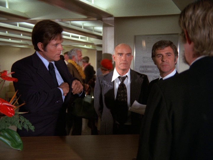 McGarrett and Danno, plus a large number of HPD cops, are alerted to the car involved in the robberies, which heads to the docks where a cruise ship, the S.S. Monterey, is preparing to leave Hawaii. There are numerous stock shots of police cars, and the tires of McGarrett's Park Lane smoke when he turns sharply around a corner.