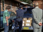 After escaping up a conveyor belt which leads to the docks, Fallon is busted and taken away by the San Francisco cops, but McGarrett turns to another officer and says, "Here's your man," indicating Gordon. Gordon is incredulous at this, but McGarrett tells him, "You and Fallon planned this whole thing. Swindled your clients … this whole phony rip-off. Proceeds to be shared by crook and victim later on. You had me fooled … Fallon was on board, and you refused to identify him. We examined the jacket that you discarded, the one with the bullet crease in it. It had powder burns on it. You told us that the gunman fired at you after you jumped out of the car. [Actually, this is not what Gordon said earlier!!] Now, powder burns are caused by a shot fired at extremely close range. You took your jacket off to do it. Not very smart, Mr. Gordon."