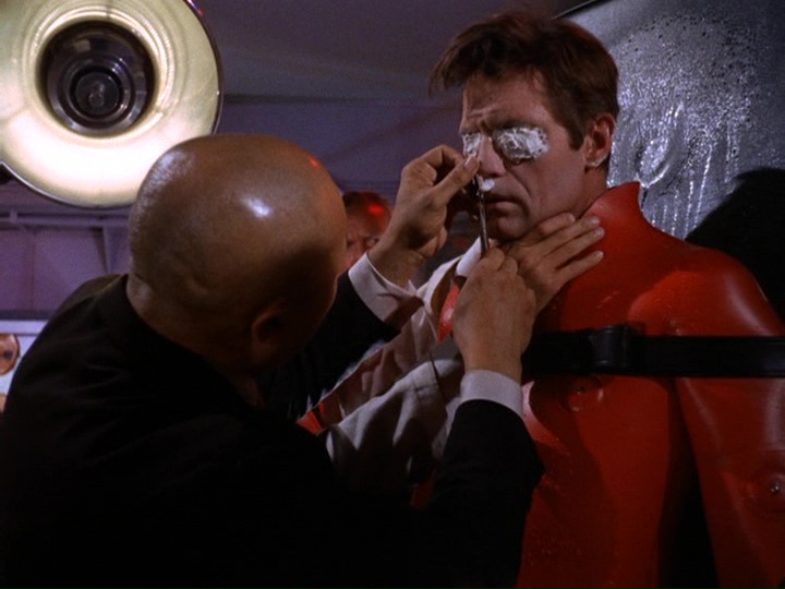 Khigh Diegh playing Wo Fat is charmingly sinister, and there is a connection to earlier movies featuring the actor, The Manchurian Candidate (1962) and Seconds (1966), both directed by John Frankheimer, which also involved brainwashing and programming. "Intelligence" operative Miller (Andrew Duggan), who is a friend of McGarrett's, is in cahoots with Wo, and McGarrett denounces Miller after he is captured near the end of the episode as a "dirty, double-dealing fink." Later, Captain Schroeder of the Arcturus (Wright Esser) tells Miller that he will receive "thirty pieces of silver" for his complicity, suggesting he is like Judas. The long speech by Wo prior to McGarrett being put into the cocoon's large pool does tend to go on quite a while, despite a few clever lines like "As we clever Chinese say, 'the plot thickens'," and "I can see your mind racing, 'What medieval Chinese torture'?"
