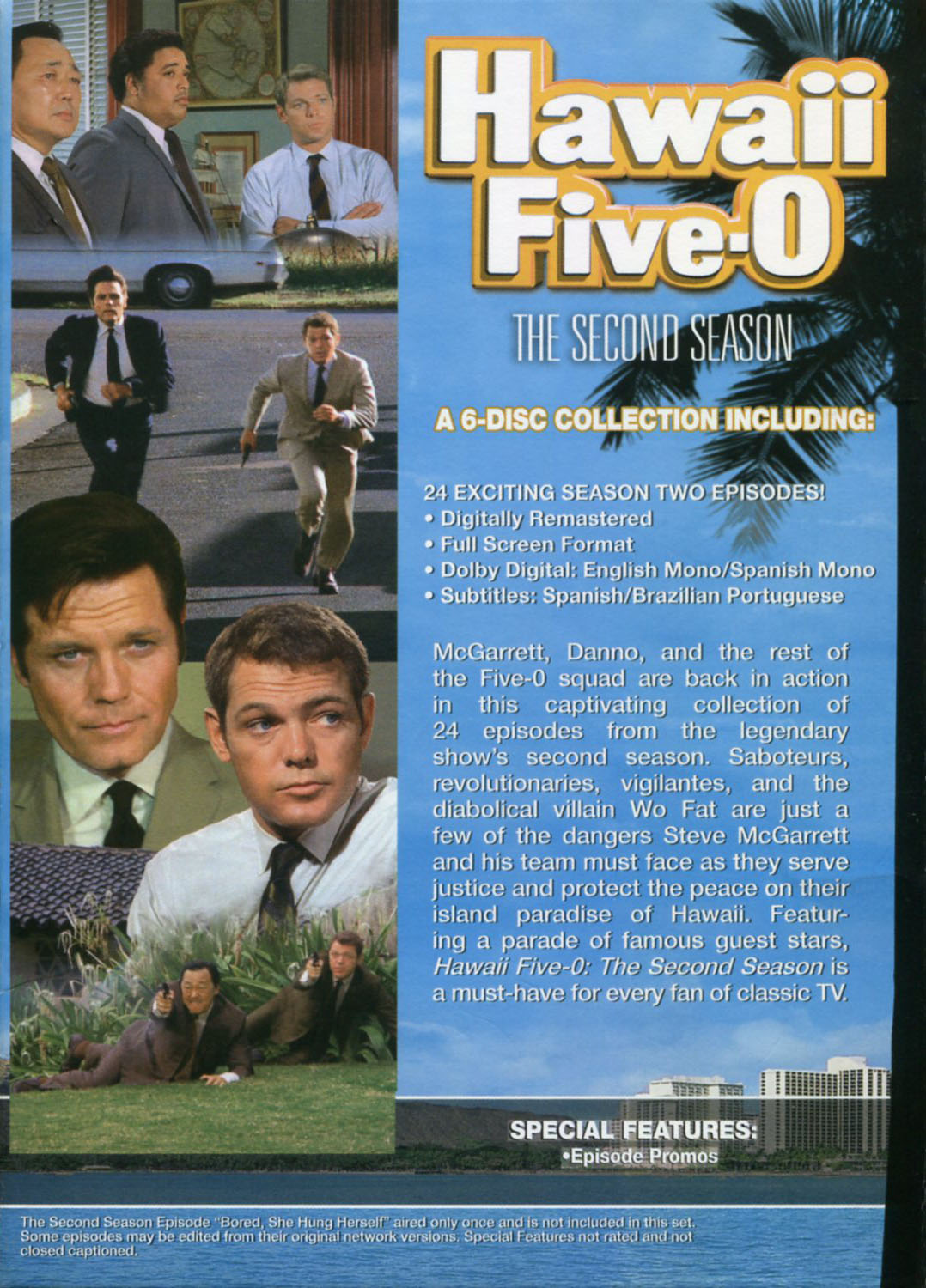 Exterior of slim-line case artwork has a front cover similar to the front cover of the box; the back cover has a listing of episodes on the two DVDs.