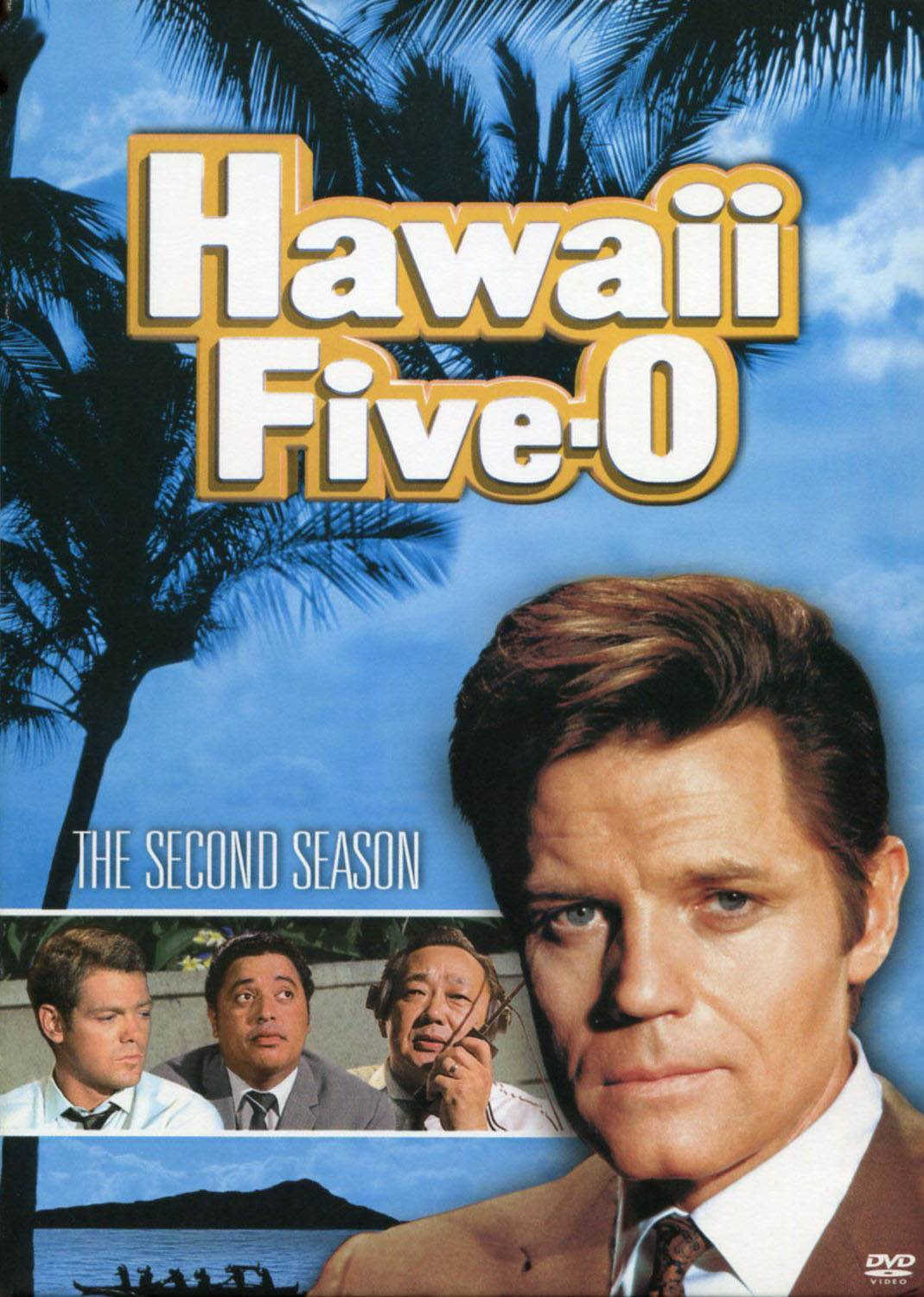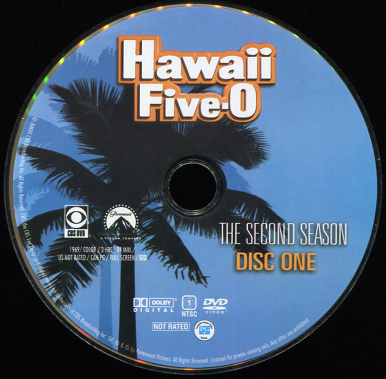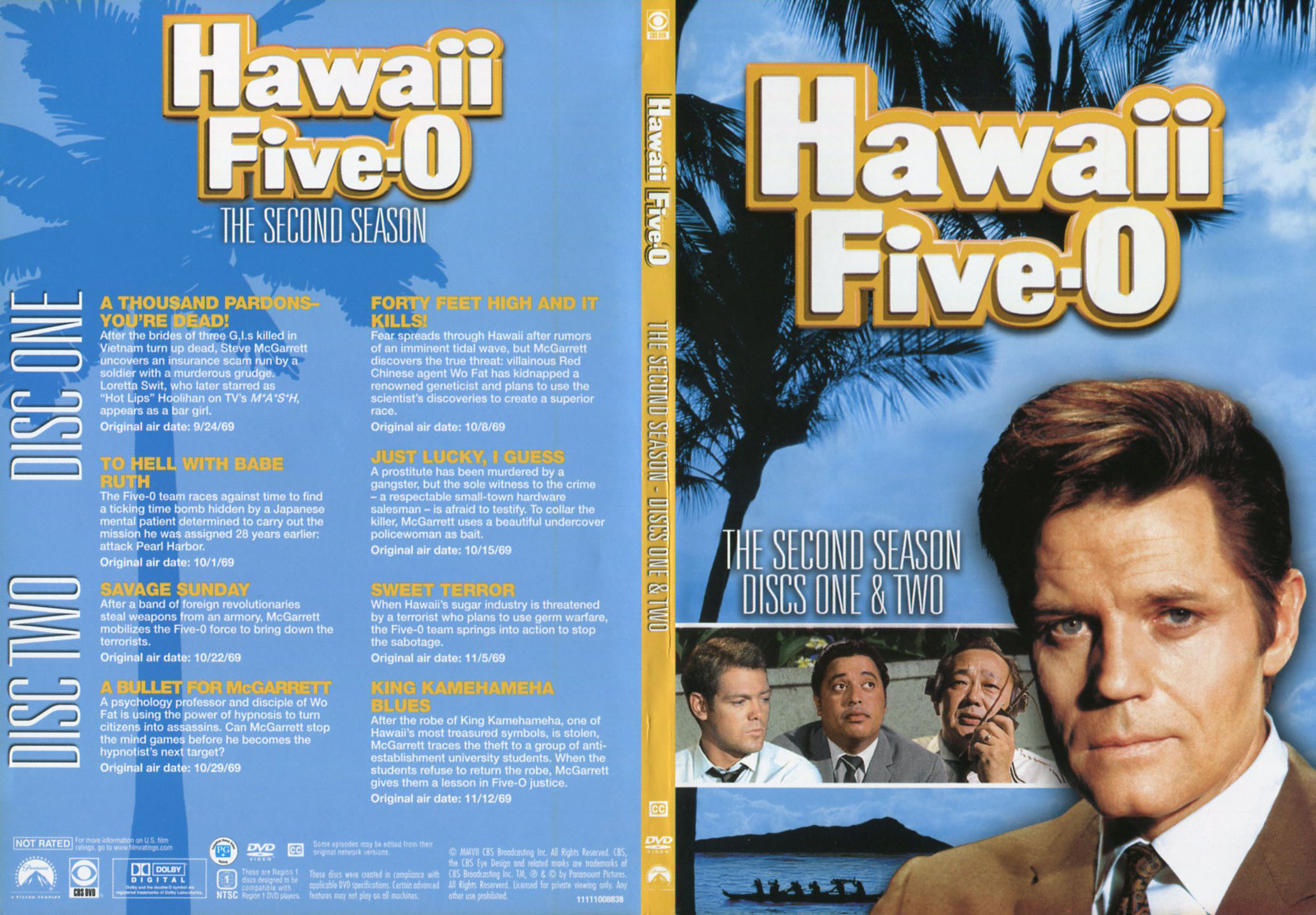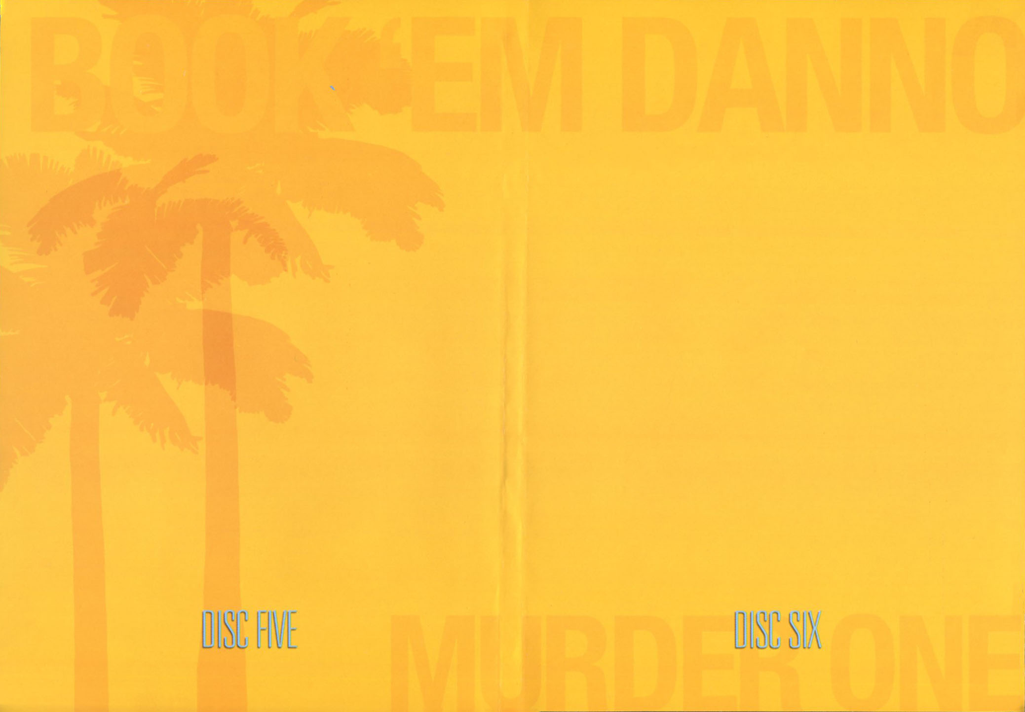 Interior of this artwork has a drawing of some palm trees with BOOK 'EM DANNO MURDER ONE at the top and bottom. This example shows the interior for discs 5 and 6, it is the same for all three slim-line cases; the photo is obscured by the two DVDs fastened to the inside left and right of the case.